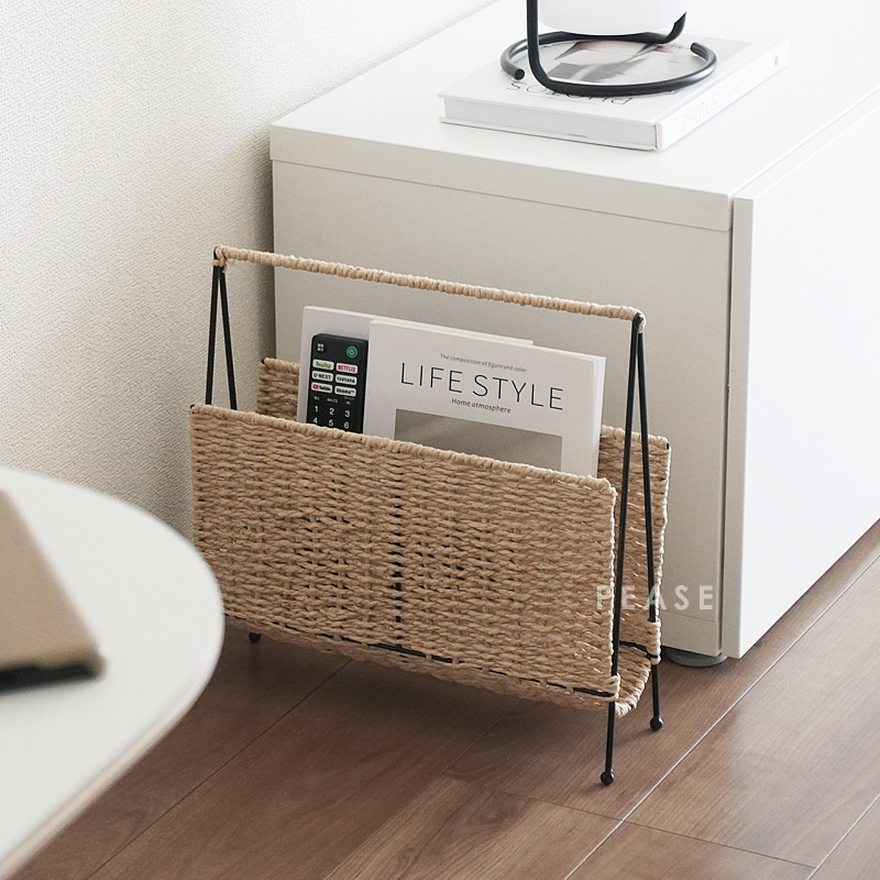 ブラックのフレームにナチュラルなベージュカラーのペーパーコードを編み込んだマガジンラックす。このマガジンラックは、雑誌や新聞などをスタイリッシュに収納できます。狭いスペースでも場所を取らずに設置できるため、テーブルの近くやソファやベッドサイドなどに置いて、手軽にお気に入りの雑誌などを取り出して読むことができます。。忙しい朝のコーヒータイムや、リラックスした夜の読書タイムにぴったりのアイテムです。