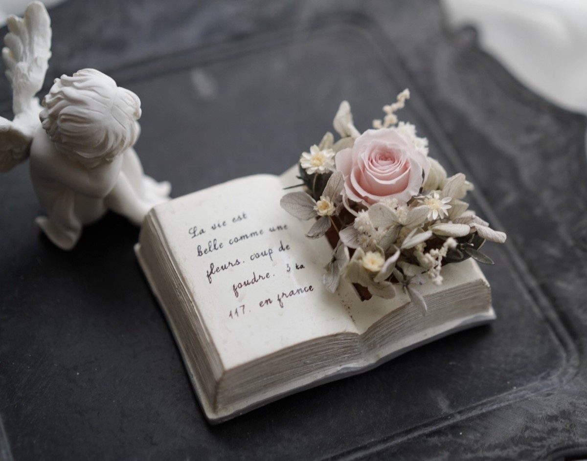 ブック型のベースとプリザーブドフラワーアレンジ。プレゼントにもお勧め!小さめのアレンジです。