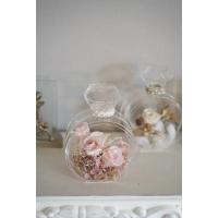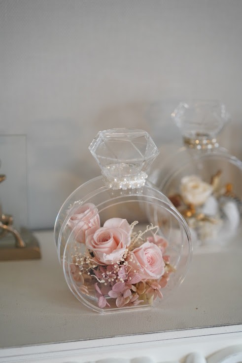 キーワード:香水ボトル型のクリアベースにプリザーブドフラワーをアレンジしました。プレゼントにもお勧め!小さめのアレンジです。