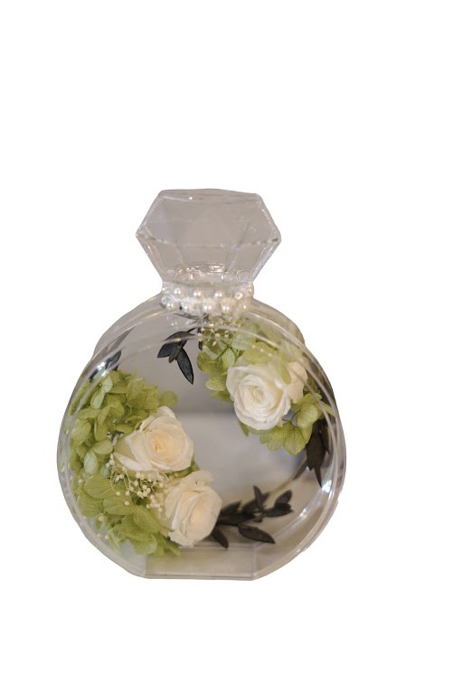 キーワード:香水ボトル型のクリアベースにプリザーブドフラワーをアレンジしました。プレゼントにもお勧め!小さめのアレンジです。