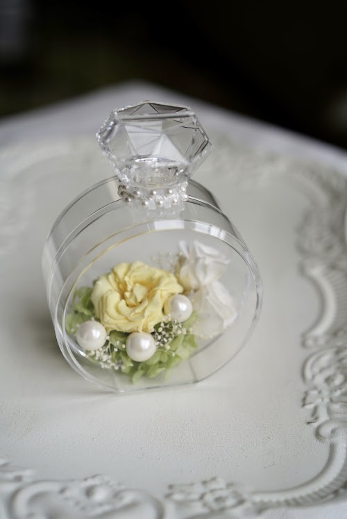 キーワード:香水ボトル型のクリアベースにプリザーブドフラワーをアレンジしました。プレゼントにもお勧め!小さめのアレンジです。