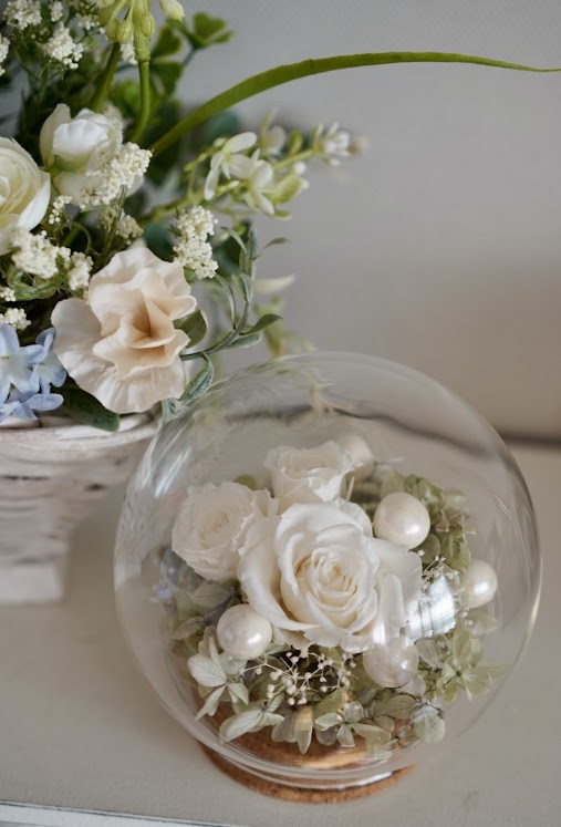 キーワード:ガラスドーム型のクリアベースにプリザーブドフラワーをアレンジしました。プレゼントにもお勧め!小さめのアレンジです。