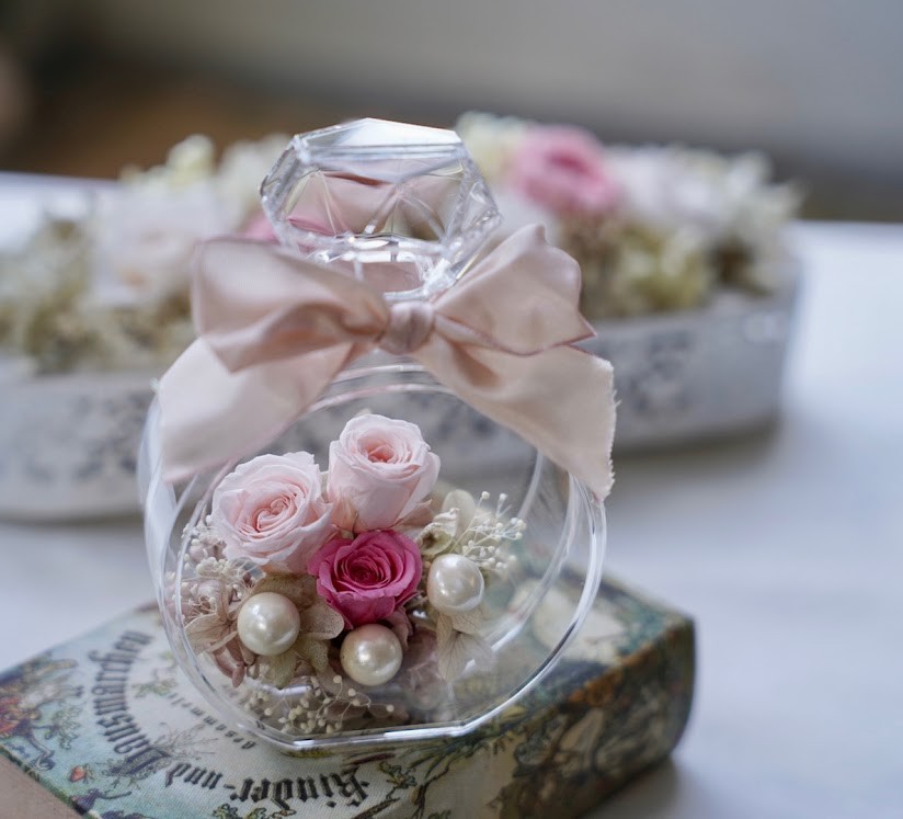香水瓶型ベースとプリザーブドフラワーのアレンジ。プレゼントにもお勧め!小さめのアレンジです。