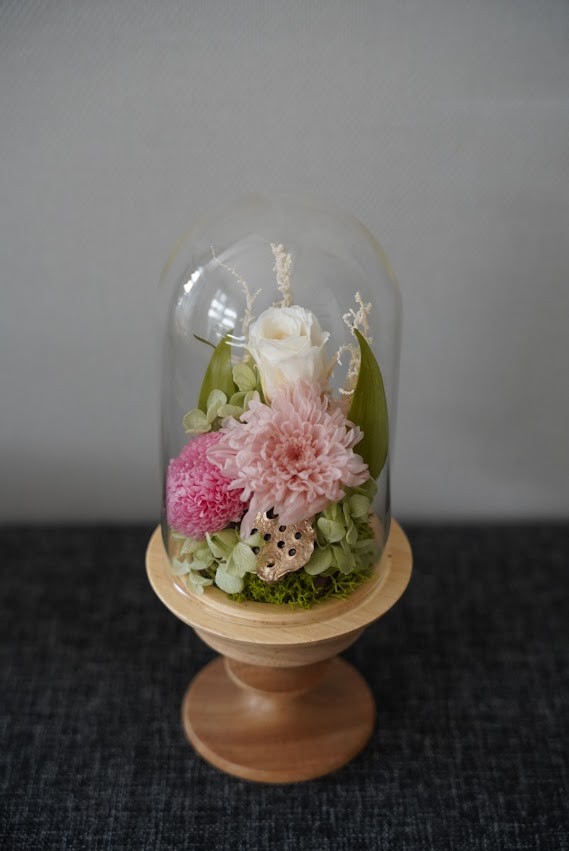 大切な人を偲ぶ。インテリアに馴染む木製のベースとガラスドームの中にプリザーブドフラワーをアレンジしました。