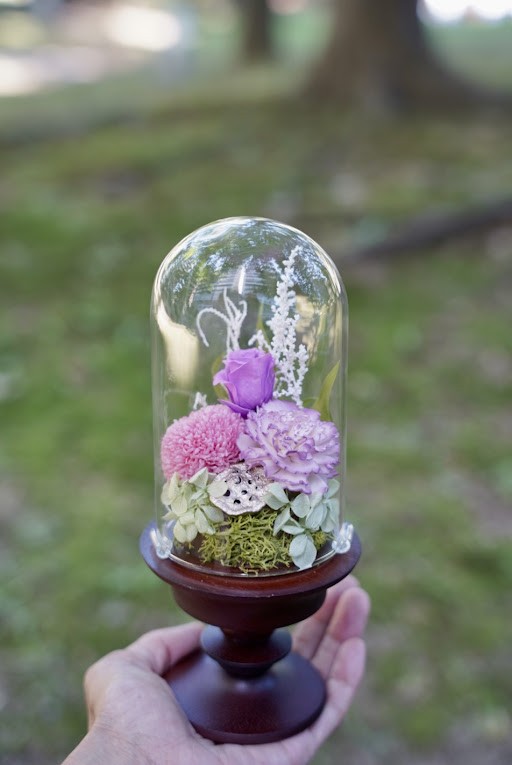 大切な人を偲ぶ。インテリアに馴染む木製のベースとガラスドームの中にプリザーブドフラワーをアレンジしました。