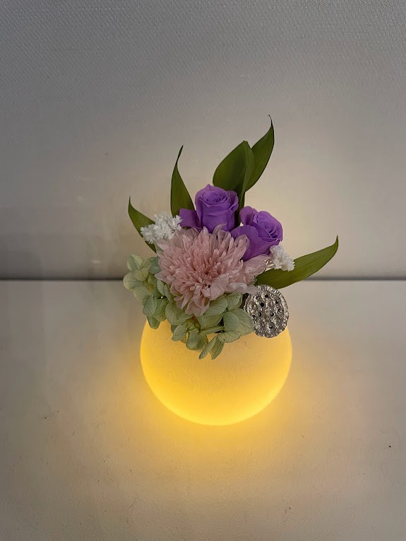 スイッチで光るワックスベースにプリザーブドフラワーをアレンジした、お供え花