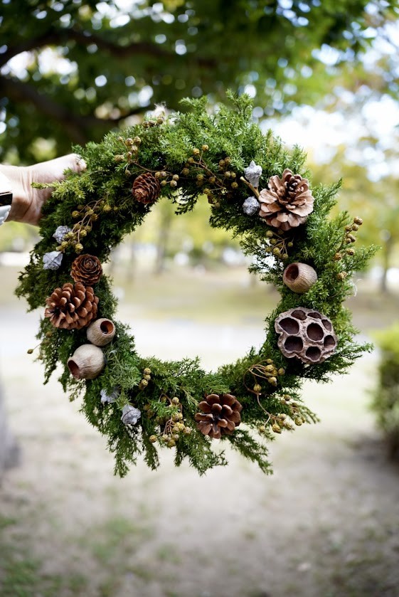 プリザーブド加工のヒムロ杉、松笠やドライの実を使いました。