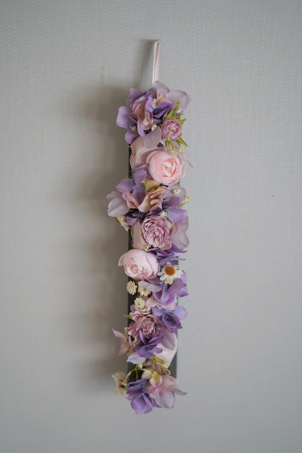 アーティフィシャルフラワーでお作りした、ピンクパープル色のお花を使ってアレンジしました。