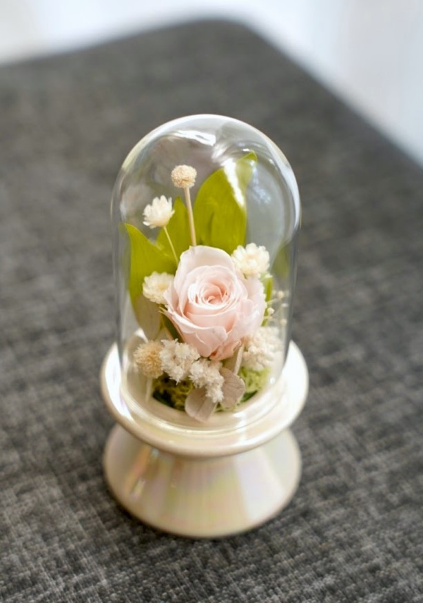 ガラスドームの中にアレンジしているので、お花も長持ちし、ほこりも気になりません。