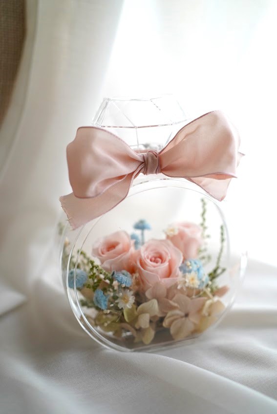 香水瓶型ベースとプリザーブドフラワーのアレンジ。プレゼントにもお勧め!小さめのアレンジです。