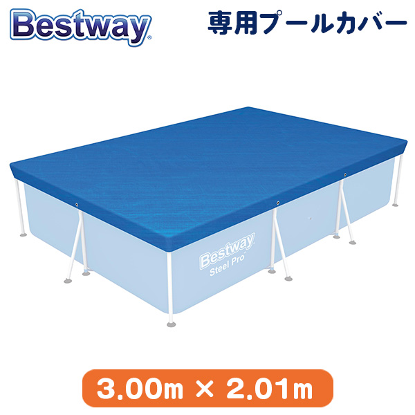 Bestwayの長方形型のスチールフレームプールの専用カバーです。頑丈なポリエチレン素材製で耐久性に優れ、風で飛ばされにくい固定用ロープと雨水を逃がす排水穴付き。