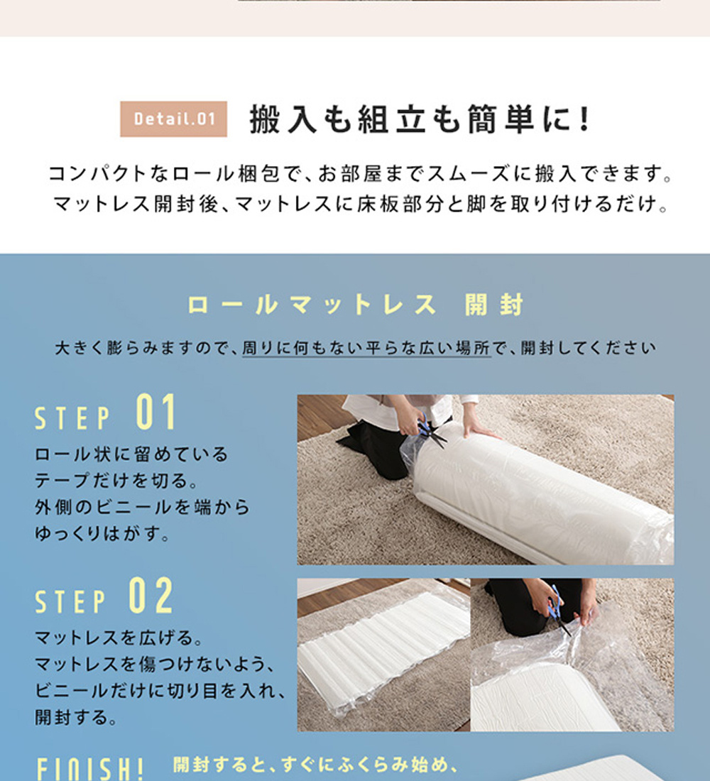 ロール梱包でのお届けなのでお部屋までスムーズに搬入可能、組み立ても簡単です!