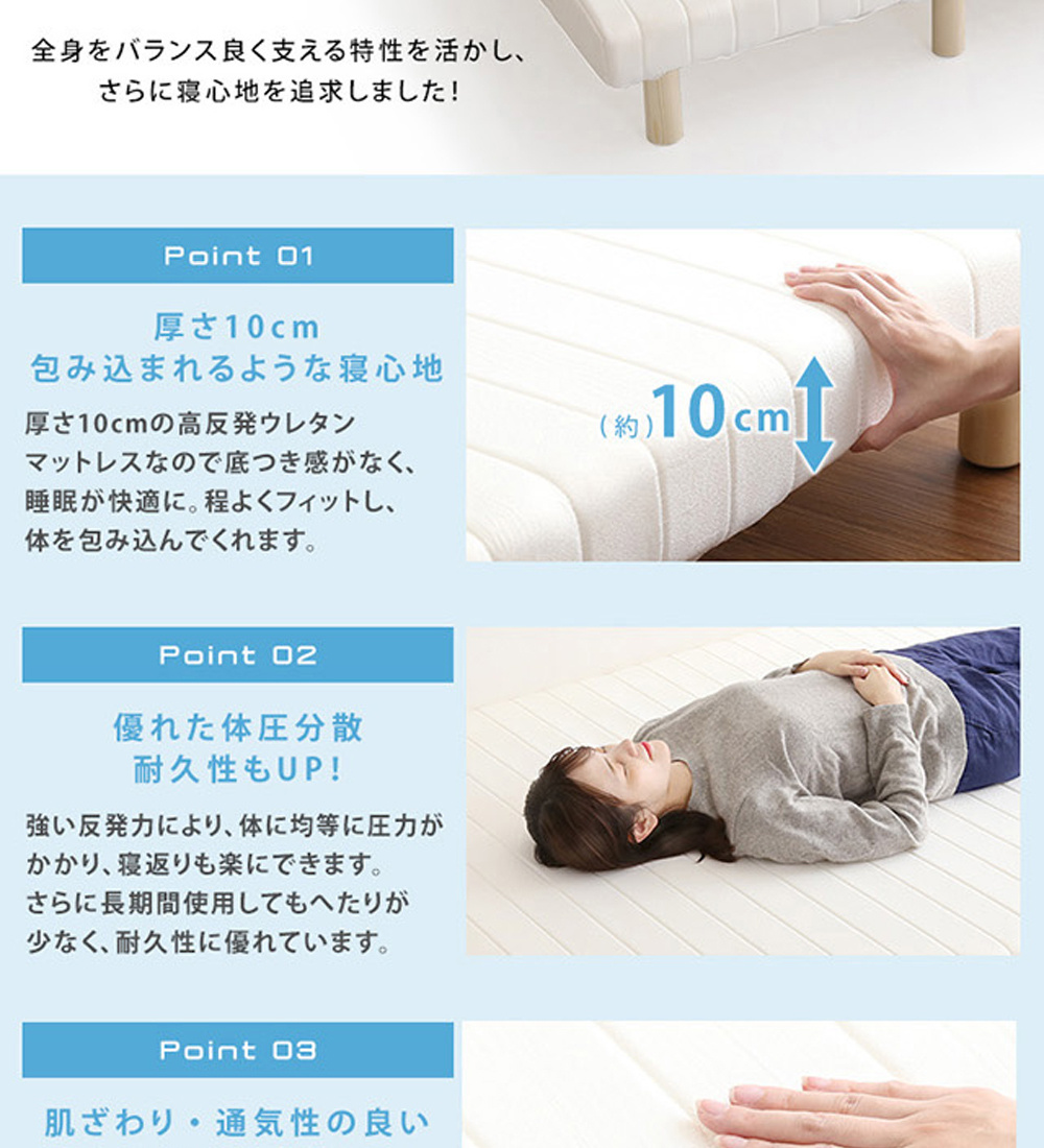 耐久性にも優れた頑丈設計でほどよい弾力かつ安定感のある寝心地のウレタンマットレスです。