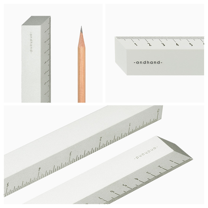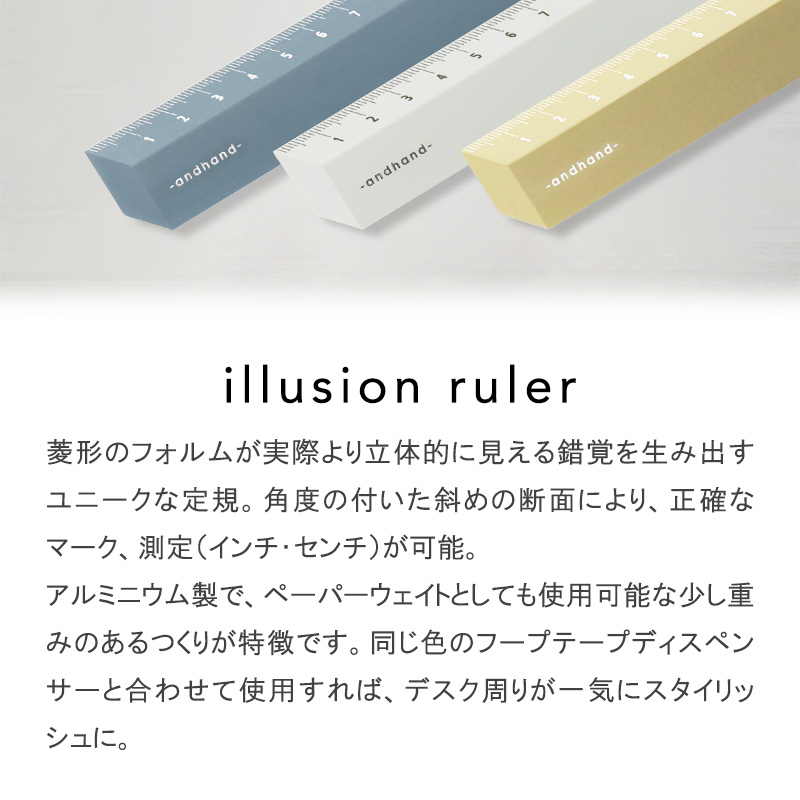 菱形のフォルムが実際より立体的に見える錯覚を生み出すユニークな定規。角度の付いた斜めの断面により、正確なマーク、測定(インチ・センチ)が可能。アルミニウム製で、ペーパーウェイトとしても使用可能な少し重みのあるつくりが特徴です。同じ色のフープテープディスペンサーと合わせて使用すれば、デスク周りが一気にスタイリッシュに。