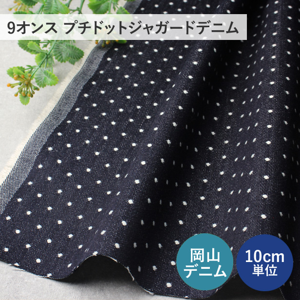デニム 生地 9オンス ジャガードデニム プチドット 岡山デニム 水玉柄 布 日本製 上質 広幅 145cm幅 ジーンズ 服作り ハンドメイド メール便1.5m 10cm単位