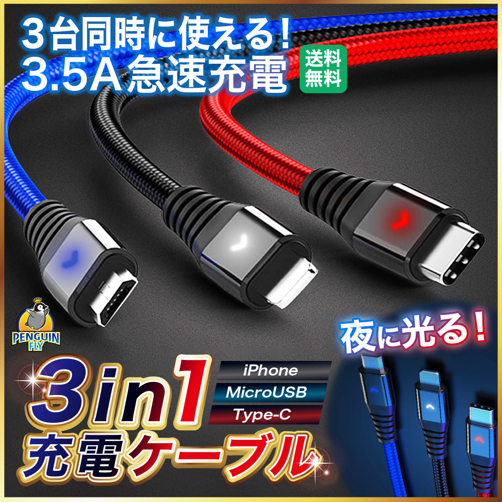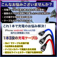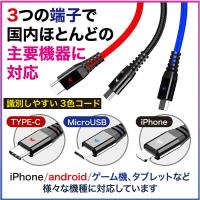 iPhone 充電ケーブル USBケーブル USB充電ケーブル マイクロb 強化素材 モバイルバッテリー 充電コード ライトニングケーブル Android microusbケーブル USB 3本 typeC Type-C 同時充電 LEDライト付き lightning ライトニング microusb アイフォン スマホ アイホン アンドロイド マルチケーブル 長い 短い オスオス コンパクト