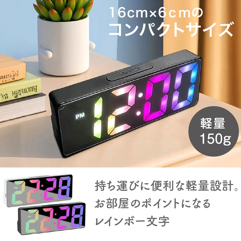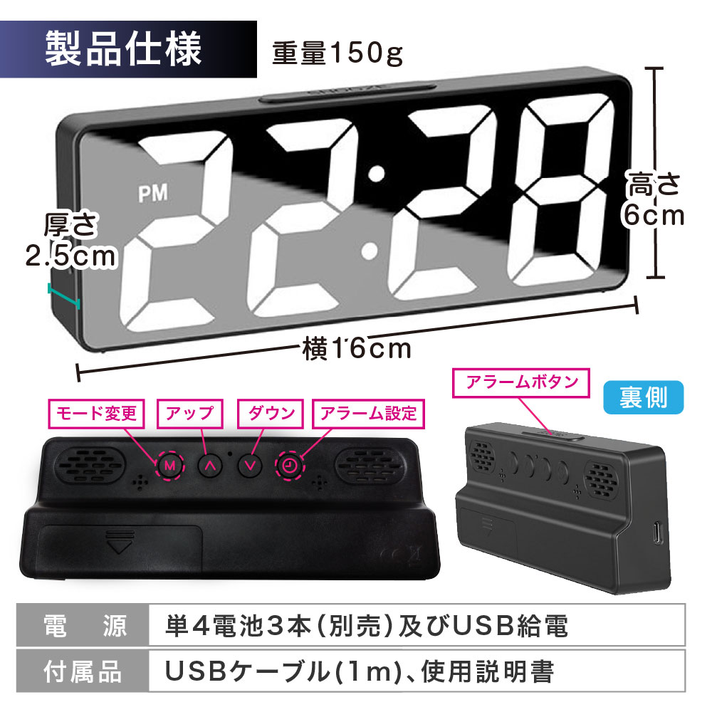 大きなデジタル表示で、夜も見やすいLEDのデジタル目覚まし時計です。 シンプルデザインでコンパクト! デジタルなので気になるカチカチ音もなく静音です。 コンパクトでも見やすい多機能時計です。 ・時間以外も日付、温度表示も可能。 ・デジタル表示の明るさ調整可能。 ・電池式、USB給電式の2種類の給電方法 ・音感コントロールで文字盤が点灯(電池給電時のみ) サイズや付属品情報は商品画像を参照下さい。