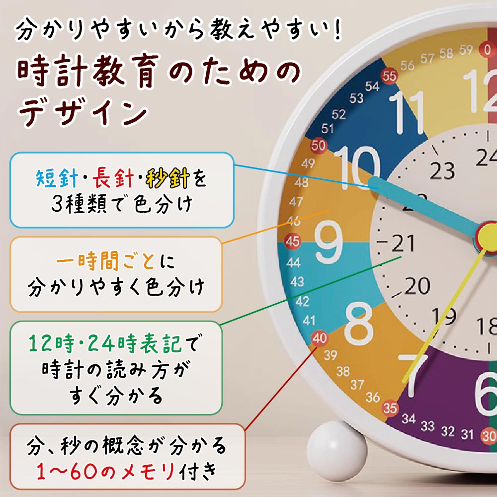 長針・短針・秒針も色分けされて教えやすく設計されています。