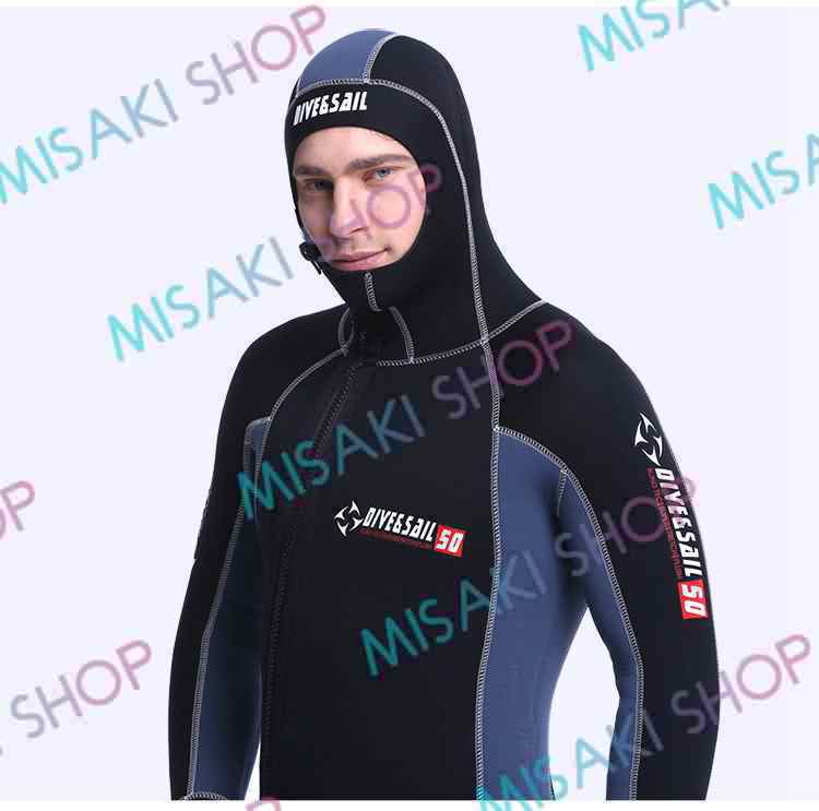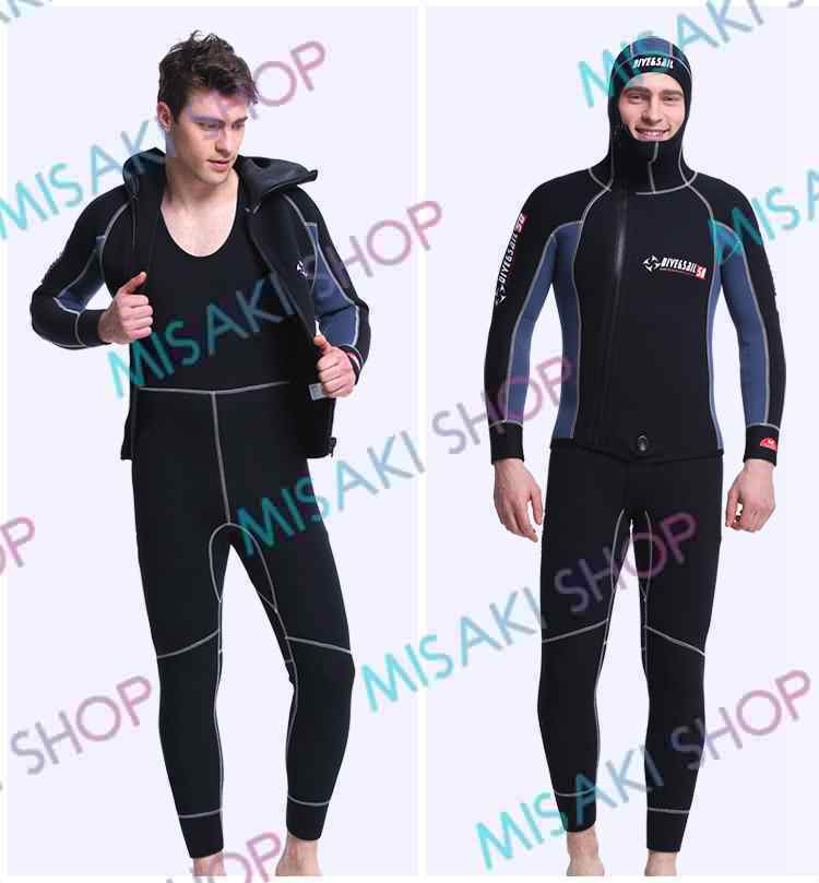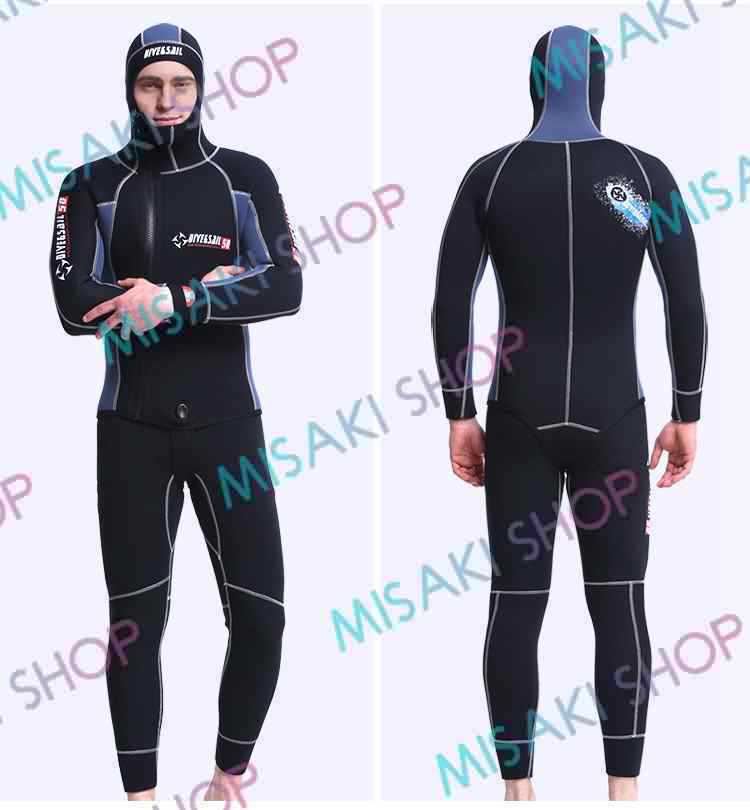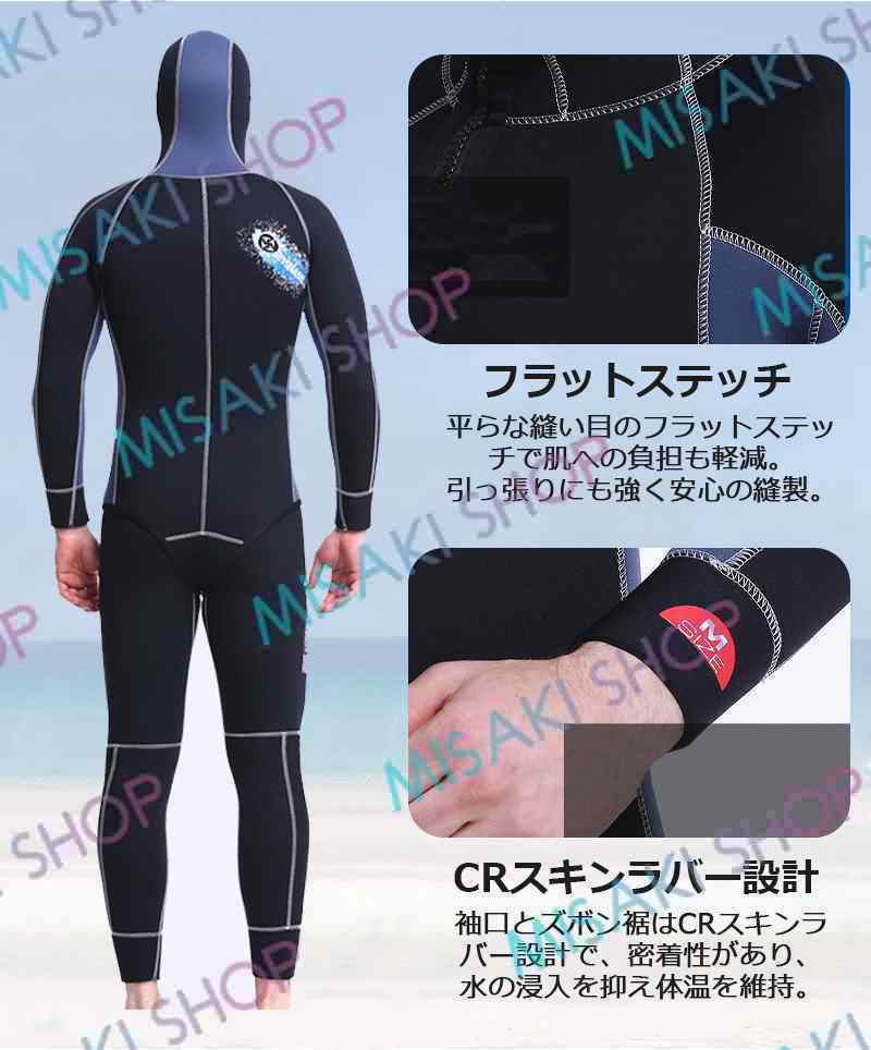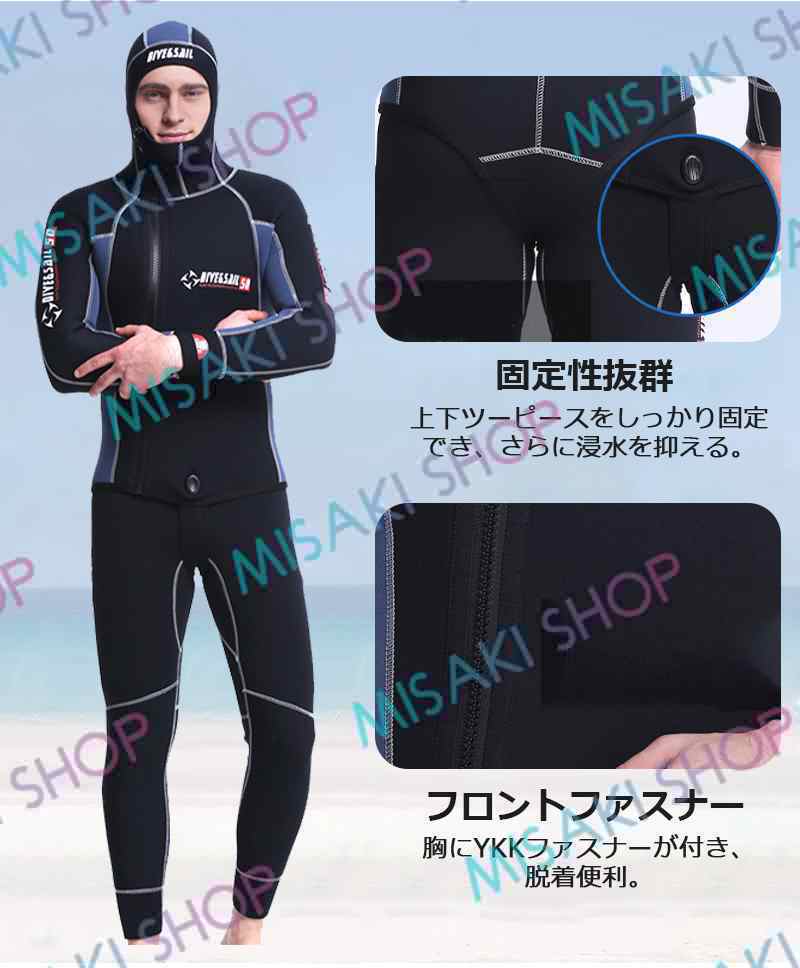 【5mm厚さ&ロングジョン仕様】フード付き 裏起毛 2ピース 上下セット メンズ ウェットスーツ フルスーツ トライアスロンウェア 素潜り ネオプレン 冬 防寒
