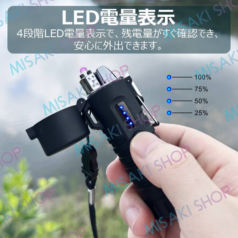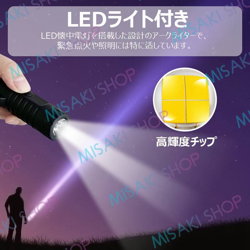 【LED懐中電灯&電量表示】LED懐中電灯を搭載した設計のアークライターで、緊急点火や照明には特に〓しています。4段階LED電量表示で、残電量がすぐ確認でき、安心に外出できます。