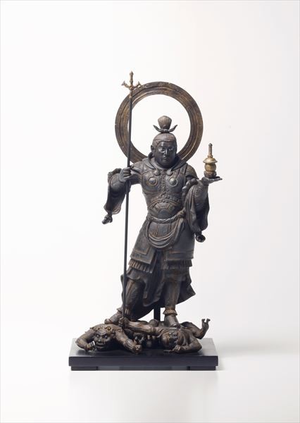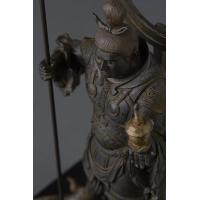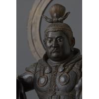 | 瞳にみなぎる逞しき躍動感 理想を尽くした造形美の結晶 ■イスムこだわりの造型 実物の持つ質感と量感を徹底検証してつくり上げた造型を損なわないよう、細部まで妥協のないモデリングを目指した。 玉眼の輝きは6回に分けて彩色を施しその力強い眼力を再現。丁寧な彩色と研磨によって生み出される、年月を経た漆の美しい古色が目を奪う。黒光りする胴体 とらんらんと輝く眼の強い対比が見るものを引き込む。 ■製品のモデルとなったのは 北条時政の命により建立された寺院に伝わり、2013年に国宝指定された「毘沙門天立像」を再現。平安から鎌倉へと時代が変わろうとしている文治 2(1186)年に、名仏師運慶の手によって造像された。 躍動感あふれる姿は東国武士のたくましさを想起させ、運慶の新時代への意欲と確かな力量がうかがえる名品。 ■毘沙門天とは インド神話に登場する財宝の神クベーラが仏教に採り入れられたもので、戦いを勝利に導く武神として多くの武将たちに信仰された。四天王の一尊としては多聞天と呼ばれ北方を守護する。また七福神の一尊として財福を授ける福徳神としての一面も持つ。 重さ約380g | |