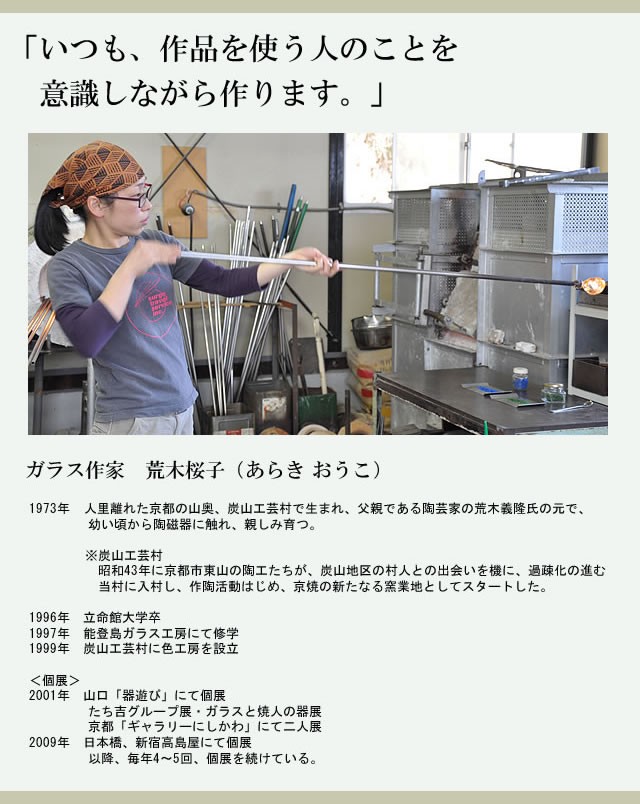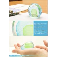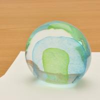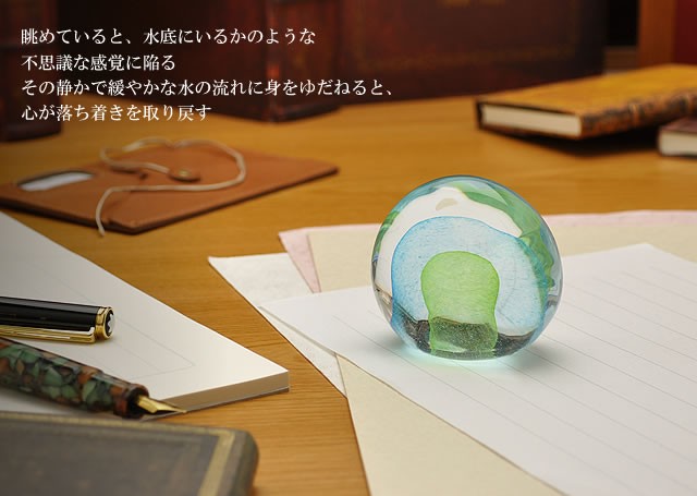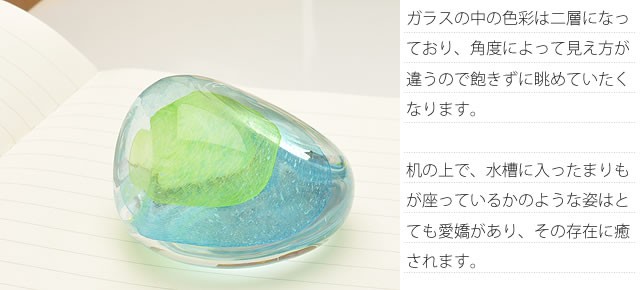 | 水の底で生きるまりも。そこは音もなく緩やかに時間が流れている。そんな空間をそのまま閉じ込めた「色工房 ペーパーウェイト まりも」。鮮やかな色彩は毬のように美しく、見れば見るほど水底の世界に吸い込まれてしまいそうな不思議な空間を醸し出している。 ペーパーウェイトとしての機能はもちろんのこと、人の目を楽しませてくれる。まさに荒木さんの作品に対するこだわりが現れている。 |