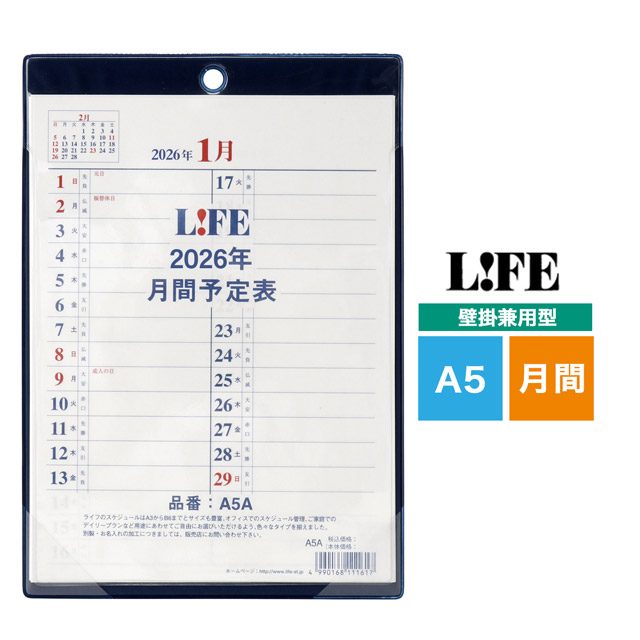 | 商品名 | LIFE(ライフ)2026年版 月間予定表 壁掛兼用型 A5サイズ D6A5A |