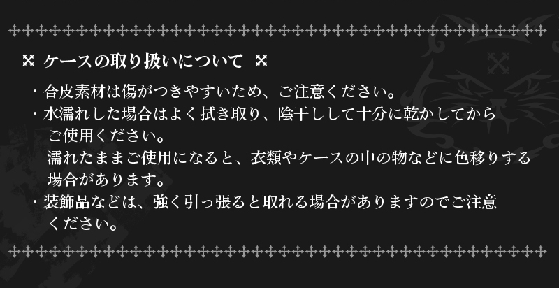 | ・合皮素材は傷がつきやすいため、ご注意ください。 ・水濡れした場合はよく拭き取り、陰干しして十分に乾かしてからご使用ください。 濡れたままご使用になると、衣類やバッグの中の物などに色移りする場合があります。 ・装飾品などは、強く引っ張ると取れる場合がありますのでご注意ください。 |