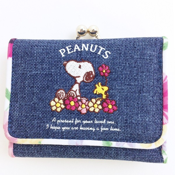 刺繍のスヌーピーとお花がポイントの可愛いブーケ柄のスヌーピーのコンパクト財布♪