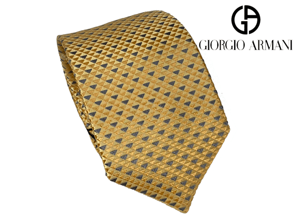 【仕様】イエロー系地に濃い黄色とグレー系の小さい三角形柄を並べた少し細めのネクタイ、大剣裏地にジョルジオアルマーニのGAロゴマーク入り、画像では写せないですがネクタイ表面に少し荒れた様な部分が数箇所ありますので少し難有りです、※多少しわやよれや細かいキズの有る場合がございます。