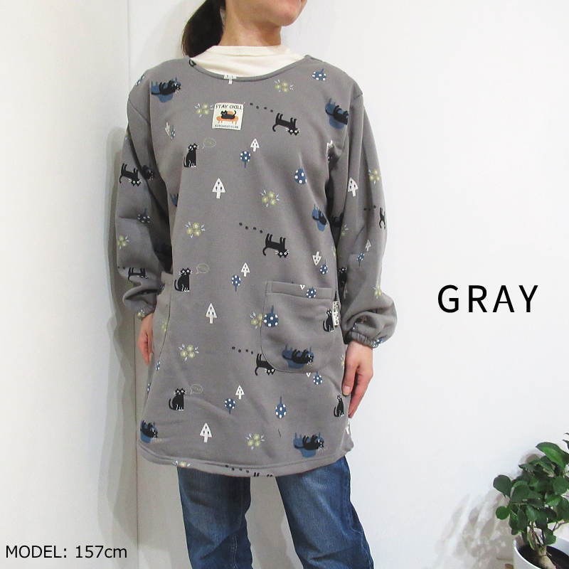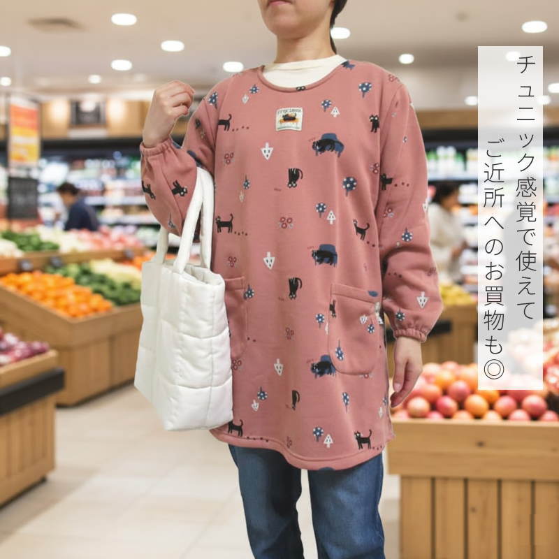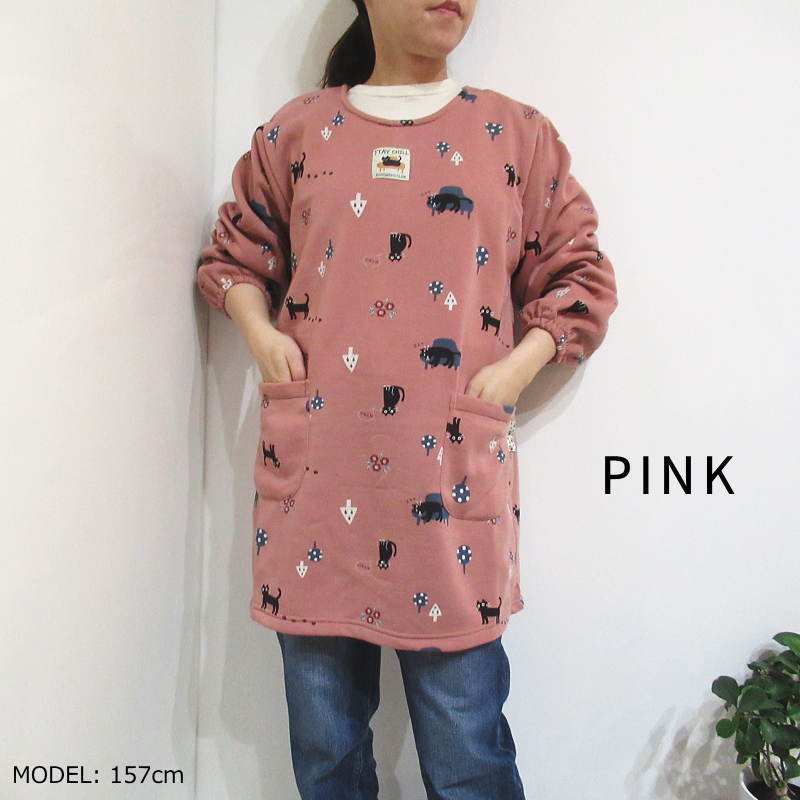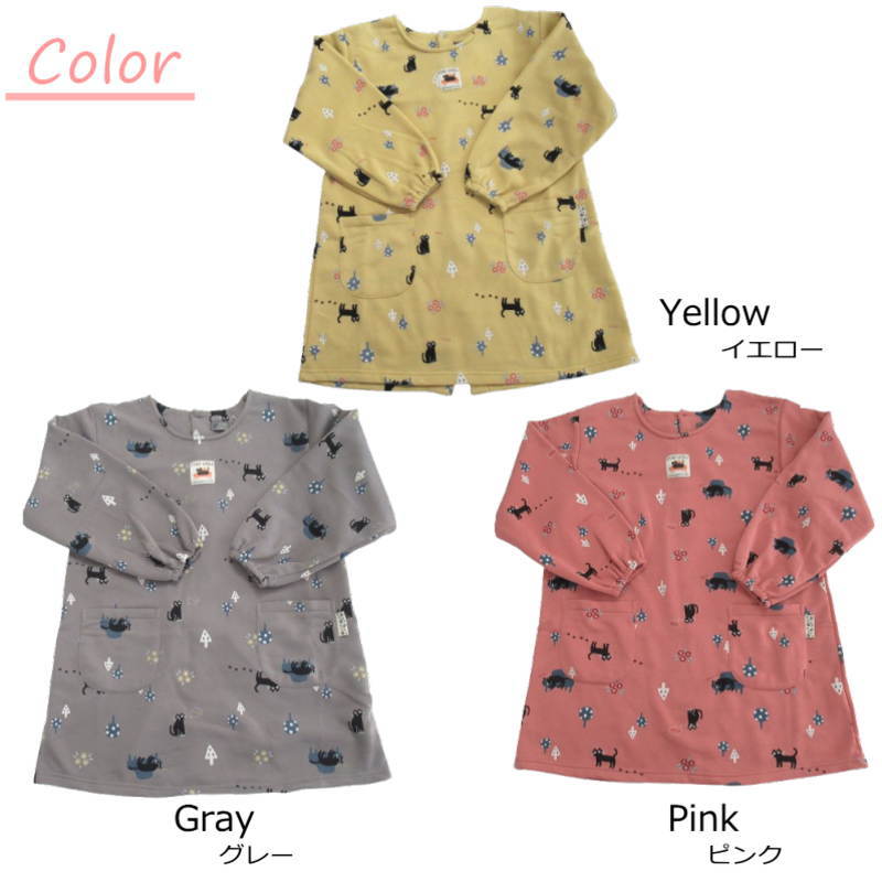 裏起毛 割烹着 冬 冬用 暖かい おしゃれ 猫柄 ネコ スモック かっぽう着 かっぽうぎ エプロン 黄色 ピンク グレー 長袖 かぶるだけ チュニック 保育士 24-19040