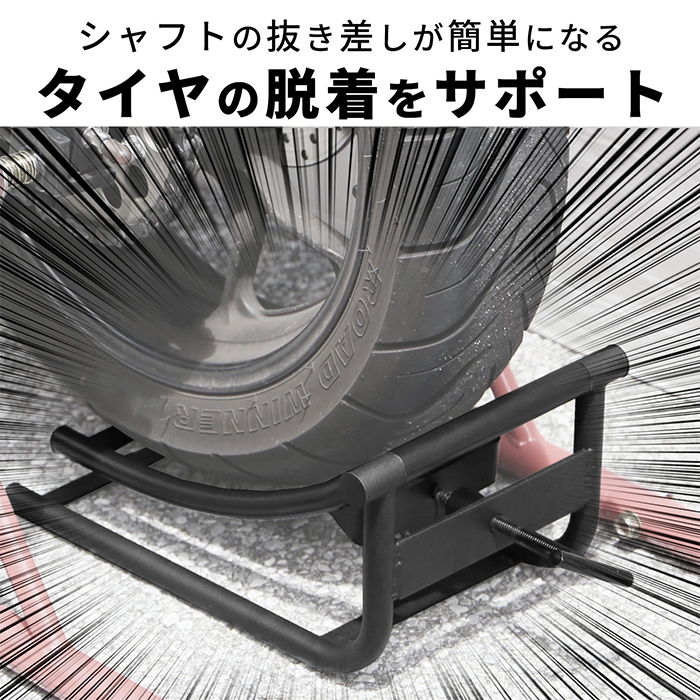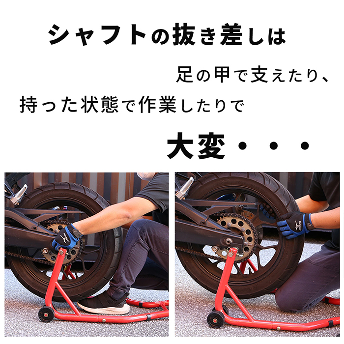 バイクのタイヤ交換でホイールを支えながら、アクスルシャフトを抜き差しする作業は大変ですよね。