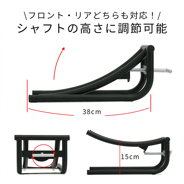 耐荷重50kg、約15cm高さ調節機能が備わっており、大型バイクのタイヤサイズに対応可能です。