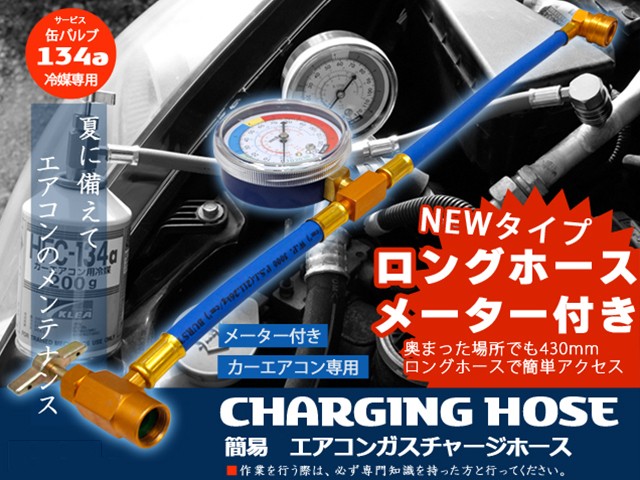エアコンガス チャージングホース R134a用 缶切りバルブ付 ロングガスチャージホース クイックカプラー メーター 説明書付 レターパック発送