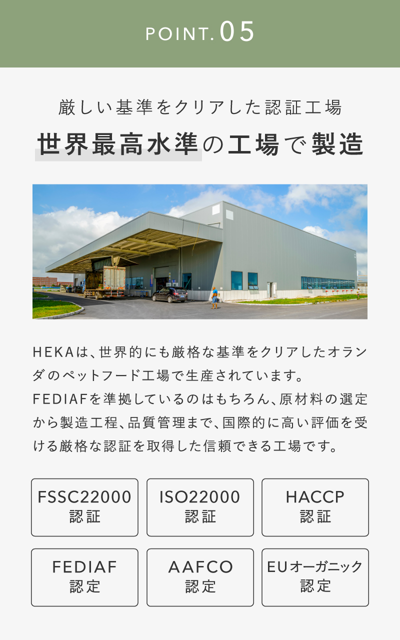 | HEKAグレインフリードッグフードは、ペット福祉において世界的に高い基準を誇るペット先進国オランダで製造されています。オランダは、ペットショップでの生体販売を禁止し、殺処分ゼロを達成した国の一つ。ペットの福祉が進んでいるオランダでは、ドッグフードの生産にも非常に厳しい法律や規制が適用されています。そんなオランダの厳しい規制下で製造されているHEKAのグレインフリードッグフードは、高品質で安全性の高い製品として愛犬の健康を支えます。 一方で、現在の日本では、ペットフードの製造に関する規制は人の食品ほど厳しくはないのが現状です。HEKA GFDは、ペットフード製造においても先進的な技術と管理体制を持つオランダで生産されており、ヨーロッパ全土に展開するトップレベルのペットフード工場で作られています。 そんなHEKA GFDの製造工場では、厳しい品質管理と最新の技術を駆使し、愛犬の健康を守るための最高品質のドッグフードを日々製造しています。世界的にも高い評価を受けているこの工場では、人工添加物や保存料、着色料を使用せず、自然由来の成分を活かした製品づくりが行われています。これにより、安心して愛犬に与えることができるHEKA グレインフリードッグフードが日々誕生しています。 |