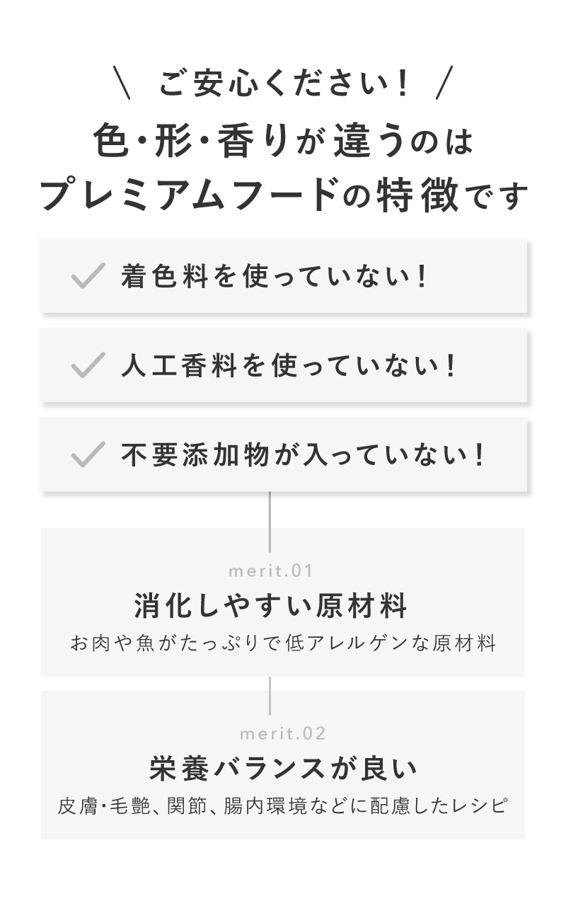 | グレインフリー / 全年齢対象 / 動物性たんぱく質が主原料 / 低アレルゲン食材を採用 / 保存料や着色料などの人工添加物は使わず同じ役割を持つハーブを配合 / ペット先進国であるオランダの工場で製造 / 未開封でもおいしさキープ、窒素充填を採用 |