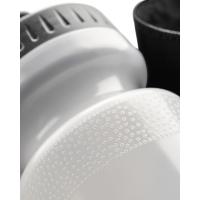 布製スリーブつきプラスチックボトル。ソフトプルトップキャップ(飲み口)。スクリュートップ(中身のあけかえ)。人間工学に基づき最適化されたグリップ。ベルトループ・カラビナつきで、取り付け簡単。プリント・刺繍に最適。容量:500ml。