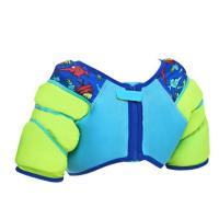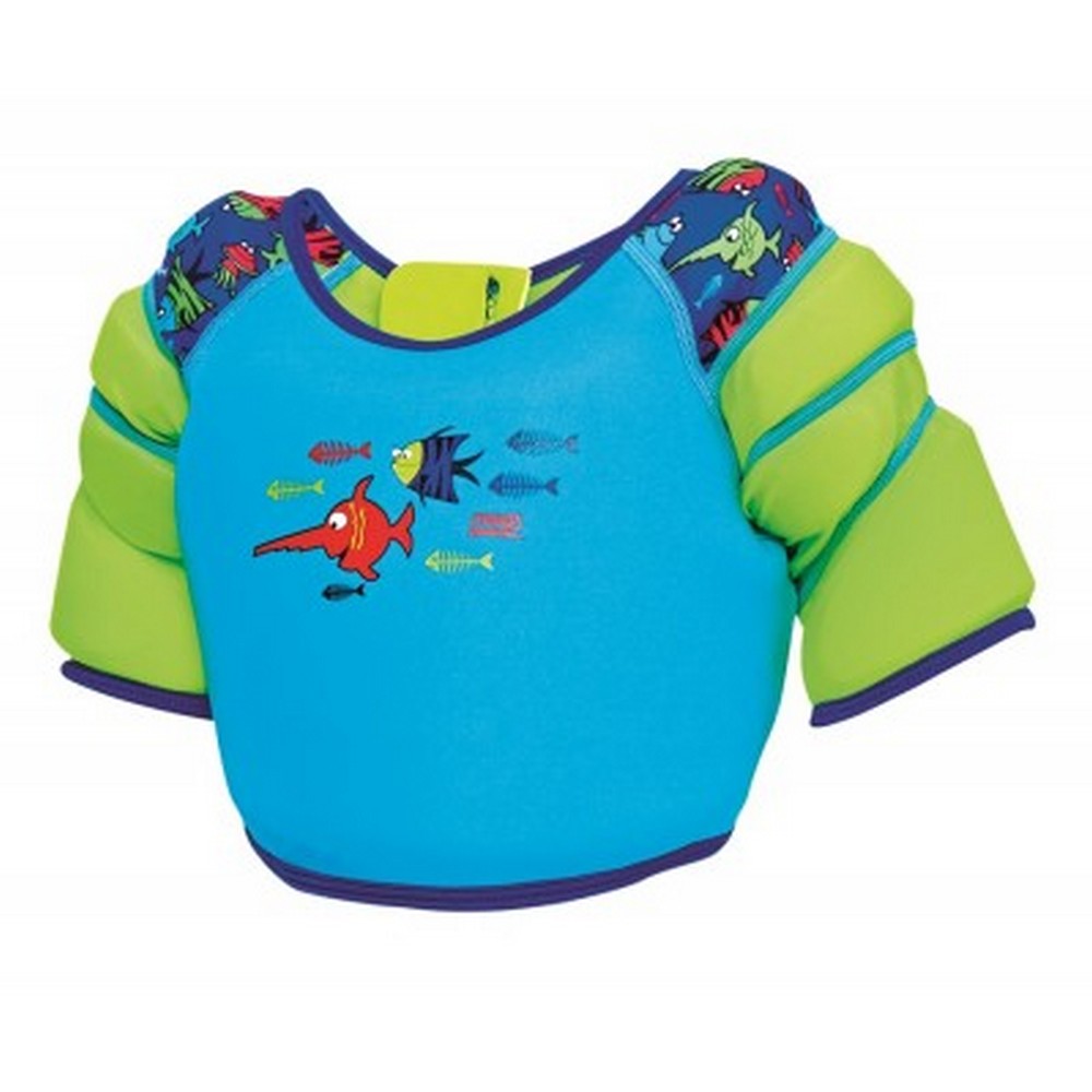 キッズサイズ/目安年齢(ヌード寸法胸囲/ウエスト目安身長): 1歳(51/46/80)、2歳(53/48/92)、3歳(56/51/98)、4歳(58/53/104)、5歳(61/56/110)、6歳(66/58/116)。素材: フォーム、ネオプレン。ソフトな肌触り。デザイン: 魚。指用タブ。安定した浮力。肩と腕に浮き輪つき。留め具: バックファスナー。