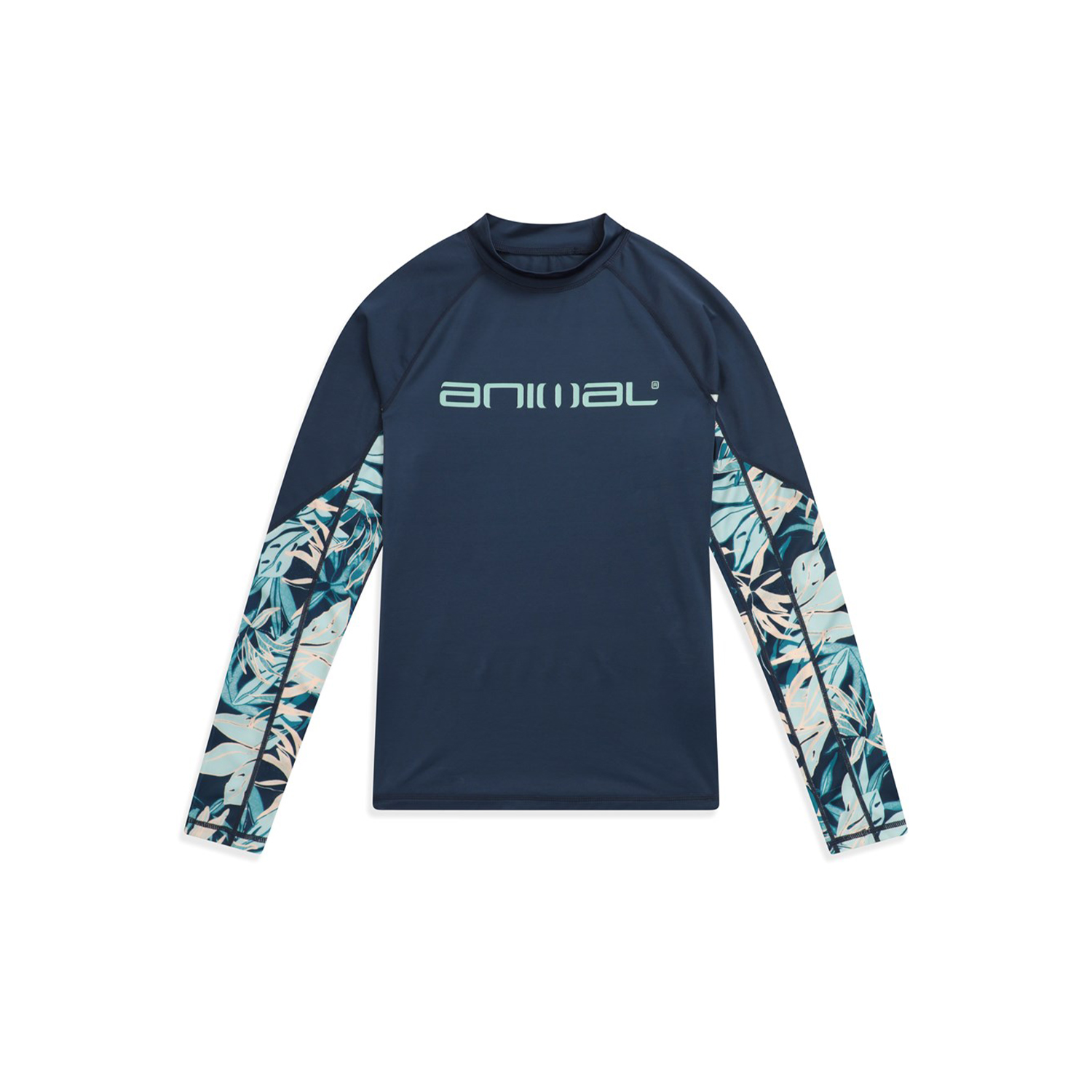Animalレディースサイズ(ヌード寸法バスト/ウエスト/ヒップcm): 6UK(81-83/64-66/89-91)、8UK(83-85/66-68/91-93)、10UK(85-89/68-73/93-98)、12UK(89-94/73-78/98-102)、14UK(94-99/78-83/103-108)、16UK(100-106/83-89/109-114)、18UK(106-112/89-95/114-120)、20UK(112-119/95-102/120-127)、22UK(119-126/102-109/127-134)、24UK(126-133/109-116/134-141)。XS(6UK)、S(8-10UK)、M(12-14UK)、L(16-18UK)、XL(20-22UK)、XXL(24UK)。85%リサイクルポリエステル、15%エラステーン。デザイン: ロゴ、スリーブプリント。ネックライン: クルーネック。プルオーバー。素材テクノロジー: 軽量、クイックドライ。塩素や塩水に強く、プールや海での使用に対応。フラットロックステッチ。袖のタイプ: ラグラン。環境に配慮した素材を使用(REPREVE)。UVプロテクション(UPF 50+)。
