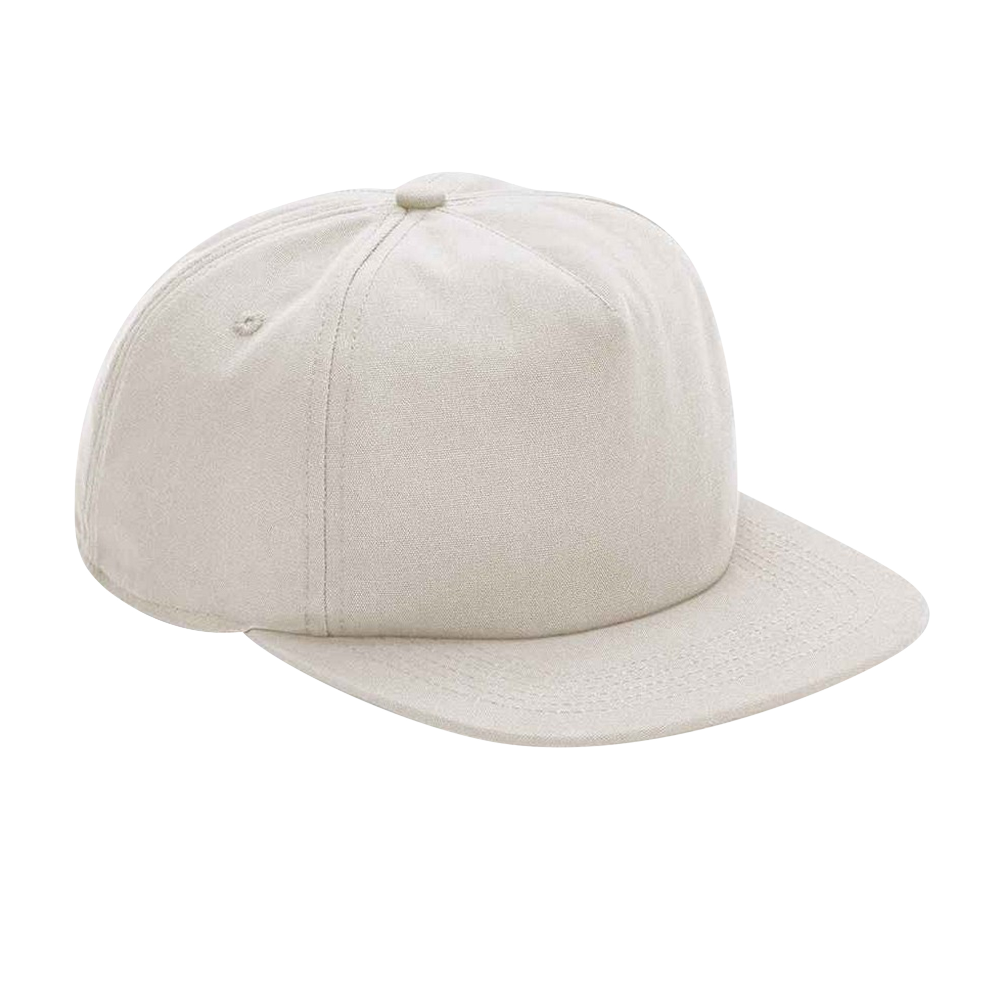 - ・ 5パネル、天ボタン、フラットバイザー、生地・形の柔らかな芯なしタイプ。
