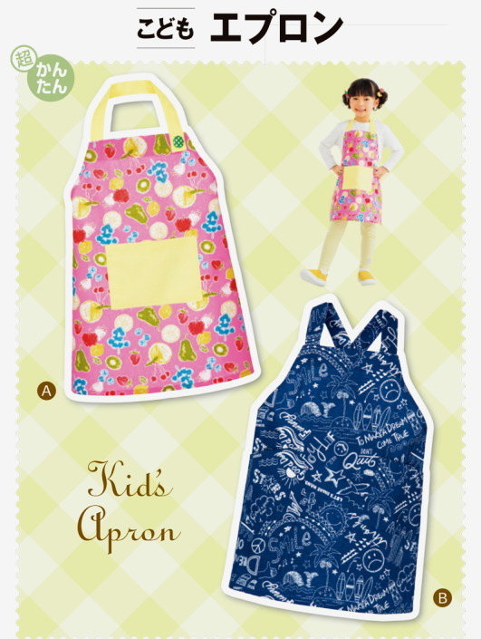 Aデザインは首ひもに面ファスナーをつけ、後ろは平ゴムを別布でくるんだ、<br>小さなお子様がひとりで着られるタイプ。