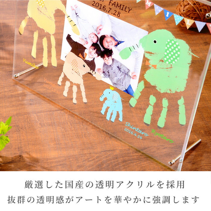 ★サイズ/縦307mm 横414mm 厚さ8mm(5mm厚×3mm厚) ★印刷面サイズ/縦307mm 横414mm ★材質/国産透明アクリルフレーム スワロフスキークリスタル誕生石 金属スタンドセット 壁掛け金具 ★写真サイズ/2L版(写真は自由に入れ替え可能です。) ★印刷/全員の手形 お名前 生年月日 メッセージ 手形採取日 ※メッセージはご自身で考えられたメッセージを入れることをおすすめいたします。 〜お仕立券について〜 ★お仕立券はご注文確定後即日、ご指定の送付先にメール便でお届けします。 〜ご注文時の注意事項〜 ★ご注文画面の【お届け先・住所】は最初に送らせていただくお仕立券の送付先になります。 ★出産祝い(ギフト)でご希望の場合は「ギフト用」をチェックしてください。ご希望ございましたらお仕立券に熨斗を付けてお届けします。 ※内祝いの場合は完成品に熨斗を付けてお届けします。 〜ご注文の流れ 他〜 ・手形・足形のとり方 もっと詳しく⇒ ・皆様からよくある質問 もっと詳しく⇒ |
