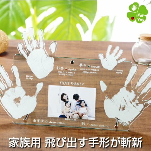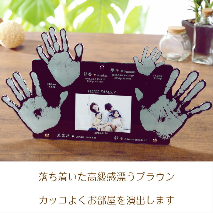 ★サイズ/ 縦270mm 横440mm 厚さ6mm ※縦・横幅は手足のサイズにより若干異なります場合がございます。 ★フレームカラー/クリア レッド ブラウン ★材質/ガラス色アクリル(3mm厚×2枚) スワロフスキークリスタル誕生石 フォトフレーム金具 ※ブラウン・レッドの背面アクリルはカラーアクリルになります。 ★彫 刻/ 家族の手形(足形) 家族のお名前 家族の生年月日 お子様の出生時刻 身長 体重 現在のお子様の身長 体重 メッセージ 採取日 ※彫刻の情報に関しましては、お申し込み後、弊社から送らせていただくお仕立て券(お申込書)にご記入ください。 ★写真サイズ/L版サイズ×1枚 ※写真は自由に差し替えできます。 〜お仕立券について〜 ★お仕立券はご注文確定後即日、ご指定の送付先にメール便でお届けします。 〜ご注文時の注意事項〜 ★当ショップの手足形キット(600円 税別) は1歳くらいのお子様までを対象としております。大人や大きなお子様は白い紙に朱肉かスタンプで採取いただくか、手を写真に撮ってお送りください。 ★ご注文画面の【お届け先・住所】は最初に送らせていただくお仕立券の送付先になります。 ★出産祝い(ギフト)でご希望の場合は「ギフト用」をチェックしてください。ご希望ございましたらお仕立券に熨斗を付けてお届けします。 ※内祝いの場合は完成品に熨斗を付けてお届けします。 〜ご注文の流れ 他〜 ・手形・足形のとり方 もっと詳しく⇒ ・皆様からよくある質問 もっと詳しく⇒ | |