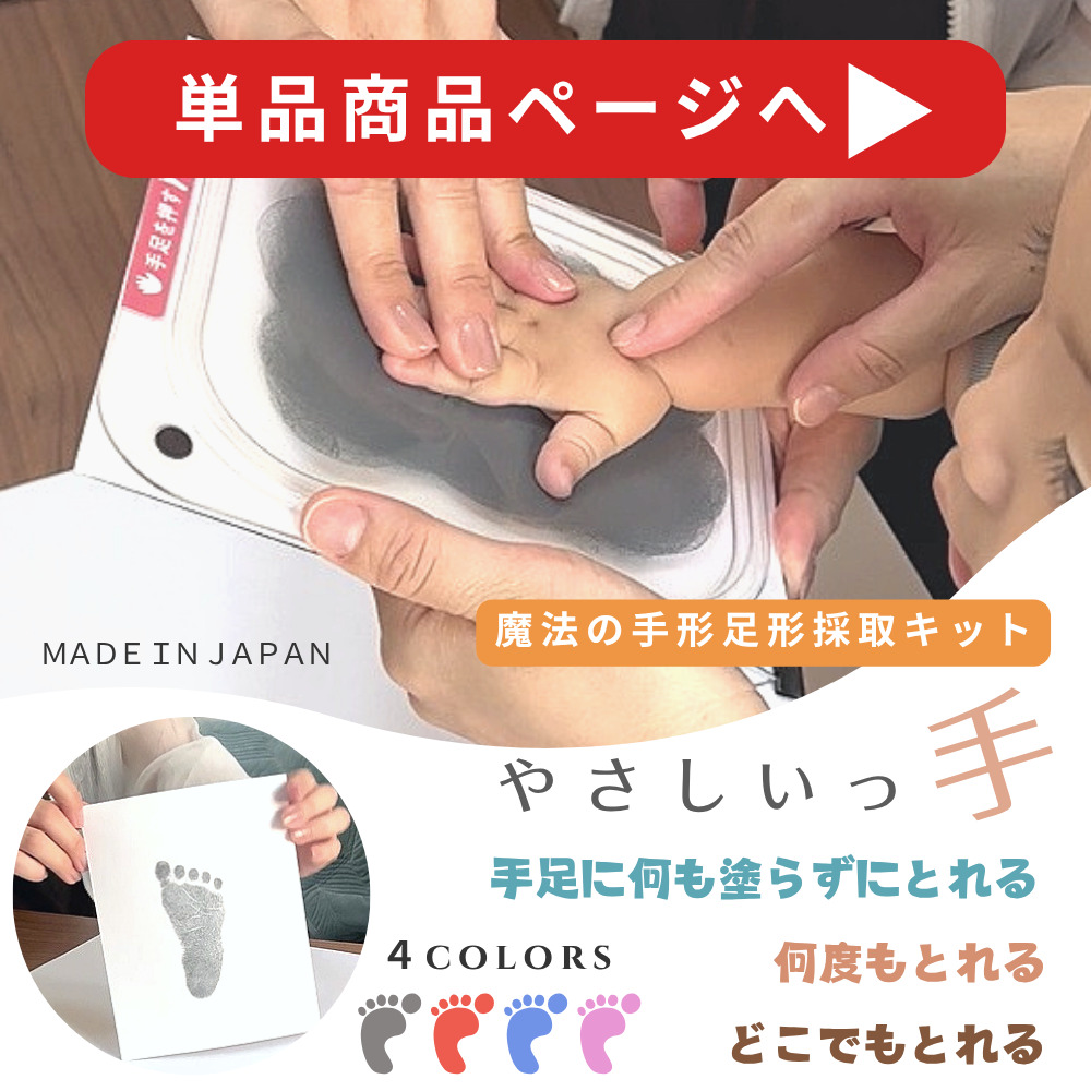 手足形をスタンプできる両面つかえるリバーシブルのマンスリーカードと、赤ちゃんの 手足形 を 全く汚さず採取出来る 手形 足形 スタンプ 「やさしいっ手」 のセットです。