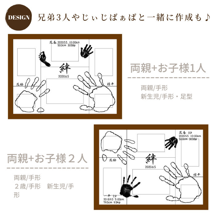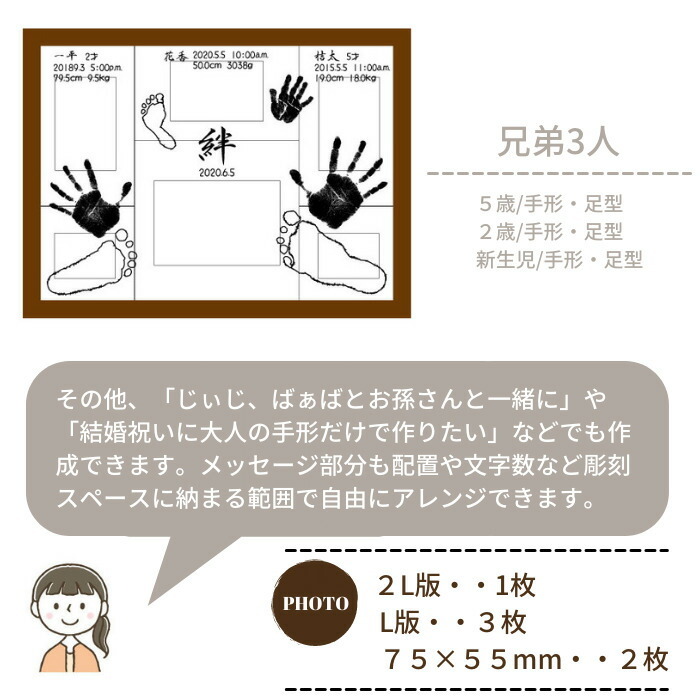 ★サイズ/縦365mm 横475mm 厚さ15mm6 ★彫刻面サイズ/縦310mm 横430mm ★材質/■フレーム外枠・・チーク材/アッシュ材 ■インナープレート・・チーク材/ポプラ材/オーク材/アッシュ材■彫刻面・・ガラス ★彫 刻/手形か足形6つまで お名前 生年月日 身長 体重 簡単なメッセージ など ※お名前、メッセージはローマ字でも可能です。 ※彫刻の情報に関しましては、お申し込み後、弊社から送らせていただくお仕立て券(お申込書)にご記入ください。 ★写真サイズ/2L版×1枚 L版×3枚 55mm×75mmサイズ×2枚 ※写真は自由に差し替えできます。 〜お仕立券について〜 ★お仕立券はご注文確定後即日、ご指定の送付先にメール便でお届けします。 〜ご注文時の注意事項〜 ★ご注文画面の【お届け先・住所】は最初に送らせていただくお仕立券の送付先になります。 ★出産祝い(ギフト)でご希望の場合は「ギフト用」をチェックしてください。ご希望ございましたらお仕立券に熨斗を付けてお届けします。 ※内祝いの場合は完成品に熨斗を付けてお届けします。 〜ご注文の流れ 他〜 ・手形・足形のとり方 もっと詳しく⇒ ・皆様からよくある質問 もっと詳しく⇒ | |