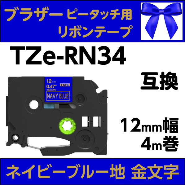 ブラザー ピータッチ・ピータッチキューブ 用 互換 TZe-RN34 りぼんテープ 12mm ネイビーブルー地 金文字