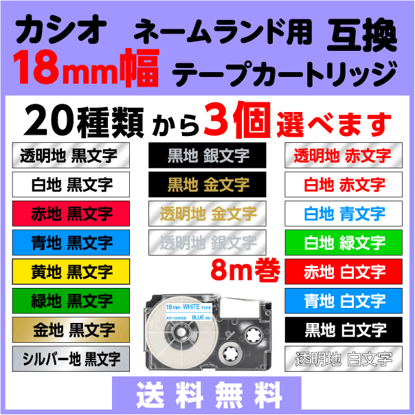 カシオ ネームランド 用 互換 テープ カートリッジ 18mm幅 フリーチョイス 20色から選べる3個セット
