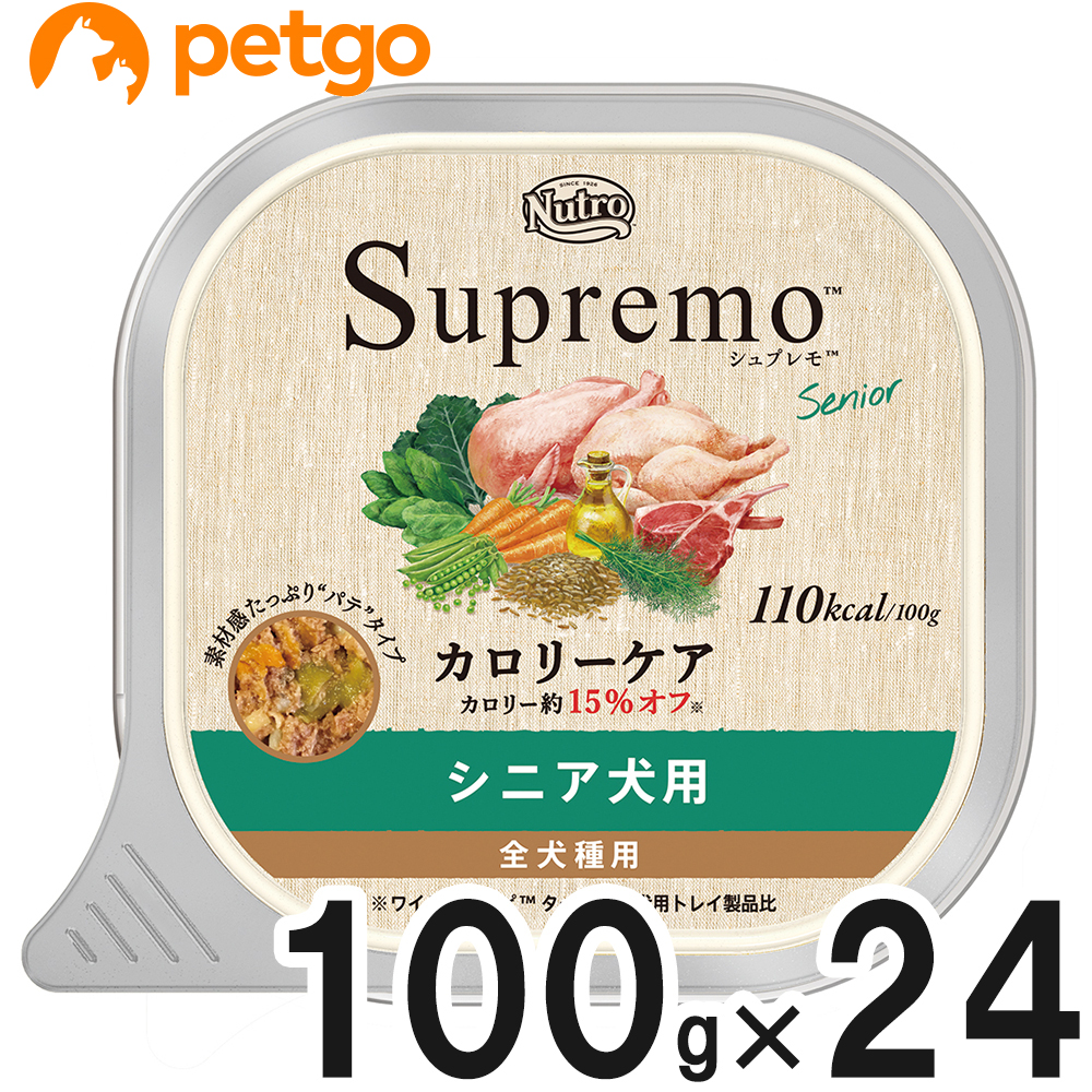 シュプレモ カロリーケア シニア犬用のカロリーはドライの約70%オフ。シニア犬は、健康な基礎代謝に配慮し、成犬時よりも1日の摂取カロリーの目安を低く抑える必要があります。低カロリーのカロリーケア シニア犬用を組み合わせて与えることで、シニア犬の健康維持に最適な栄養バランスを維持しつつ、楽々おいしくダイエットができます。また、総合栄養食のシュプレモカロリーケアは、ウェットのみでも与えることができます。高品質な自然素材の組み合わせで嗜好性が高く、やわらかくて食べやすいパテタイプなので、シニア犬の健康維持に最適です。