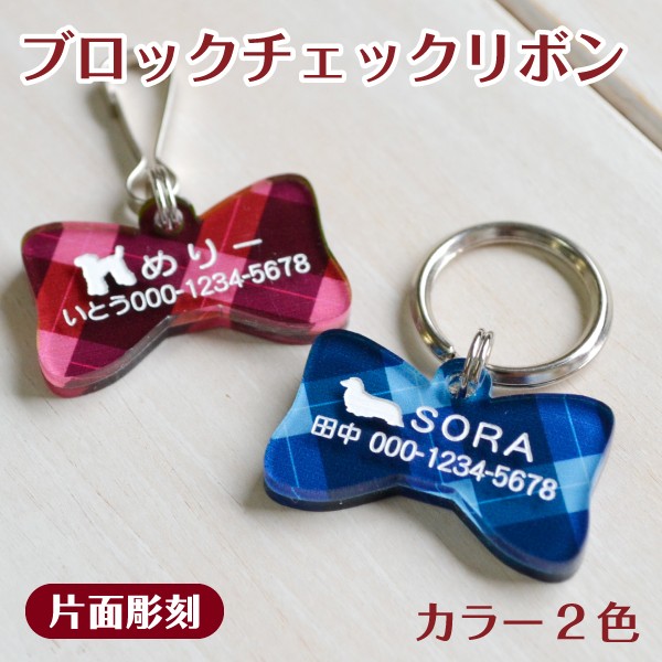 犬 迷子札 名入れ 「 ブロックチェックリボン 」 ( 片面彫刻 ) アクリル製 オーダーメイド かわいい チェック柄 シンプル