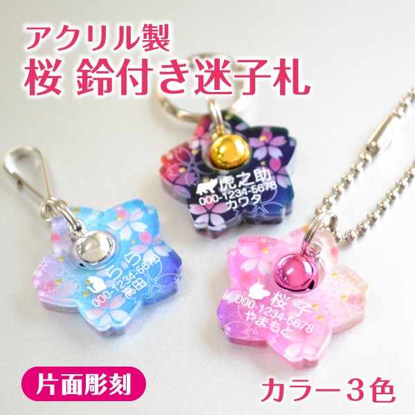 猫 迷子札 名入れ 「 桜 鈴付き 」( 片面彫刻 ) アクリル製 オーダーメイド かわいい 和風 おしゃれ